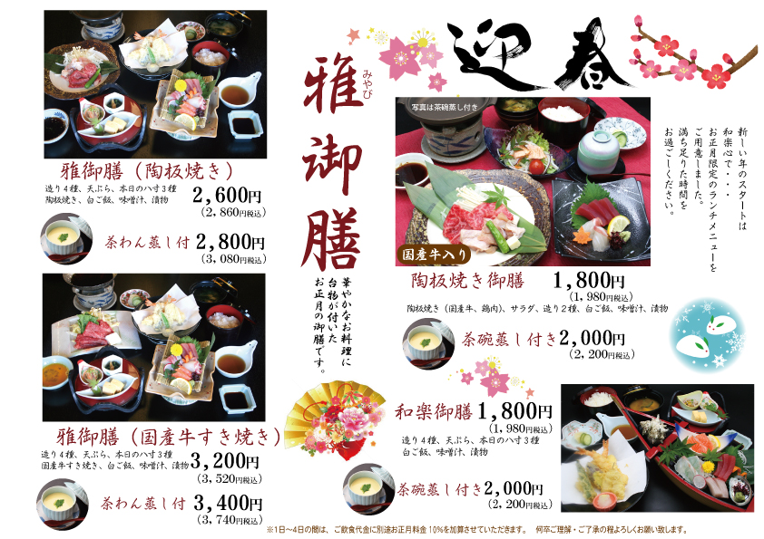 お正月料理は1月5日までとなります。※1日~4日の間はお正月料金10%を加算させていただきます。何卒、ご理解・ご了承の程宜しくお願い致します。